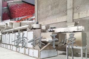 產(chǎn)品簡介:鏈板式辣椒連續(xù)干燥機是涉及一種鏈板式的 辣椒干燥機,屬于農(nóng)產(chǎn)品干燥機械的技術(shù)領(lǐng)域。針 對辣椒在干燥時隨著水分的減少,辣椒變軟,體積 減小,形成毯狀的辣椒層,傳送翻動困難、干燥不 均勻等問題,提出了一種鏈板式的辣椒連續(xù)干燥 機。鏈板式辣椒連續(xù)干燥機采用帶孔搭板和鏈條 組成的輸送裝置,輸送裝置在干燥機中以階梯狀 排布進行辣椒的輸送。工作時,帶孔搭板在輸送鏈 條上面時,帶孔搭板在自重和帶孔擋板的作用下 相互疊加,保證了辣椒層在輸送裝置上能向前傳 送,當帶孔搭板在輸送鏈條下面時,帶孔搭板在自 重和輸送鏈