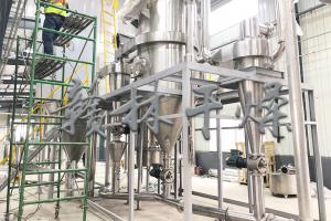 干燥塔包含:塔體、防爆照明燈、氣體分布器、溫控設(shè)備、泄壓裝置、進風管路、出風管路、氧含量測量傳感器等部件,進風管路內(nèi)部需要設(shè)置過濾裝置;霧化后的漿料在熱空氣的加熱作用下,漿料完成揮發(fā)和干燥成為粉料落向底部的出料口,氣體從排風管排除進行閉路循環(huán)管路,干燥塔材質(zhì):304不銹鋼。