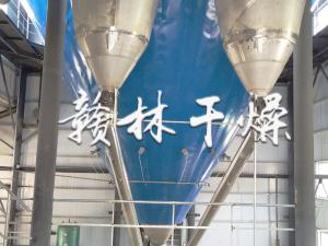 自然空氣通過風機強制進入空氣加熱器內(nèi)(電加熱,蒸汽加熱器,導熱油加熱器,燃天然氣(油,煤)熱風爐,將空氣加熱到所需的干燥溫度。加熱后的空氣通過管道送入干燥塔頂垂直式熱風分布器,直線吹下。槳液經(jīng)過壓力泵增壓后通過壓力式噴槍高速噴出,形成細霧狀,噴槍安裝在干燥塔筒體中部向上,霧粒在中部向上形成噴泉狀,在筒體內(nèi)形成垂直向下的熱風和向上的霧狀料液接觸,從而實現(xiàn)將料液進行干燥,干燥后的料液成固體粉狀產(chǎn)品混合在熱空氣內(nèi),在下落過程中重新和液狀霧粒粘合,形成霧狀長大。在干燥塔底部通過重力沉降,將粉狀產(chǎn)品和廢熱空氣大部分分離,粉狀產(chǎn)品自干燥塔底部排出,少部分產(chǎn)品被廢熱空氣一起帶入旋風除塵器(或布袋除塵器)進行二次氣固分離。將產(chǎn)品收集下來包裝。廢熱空氣由引風機排出.